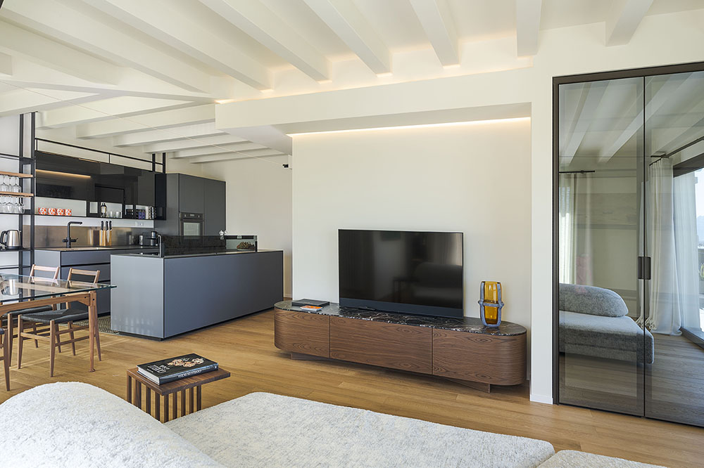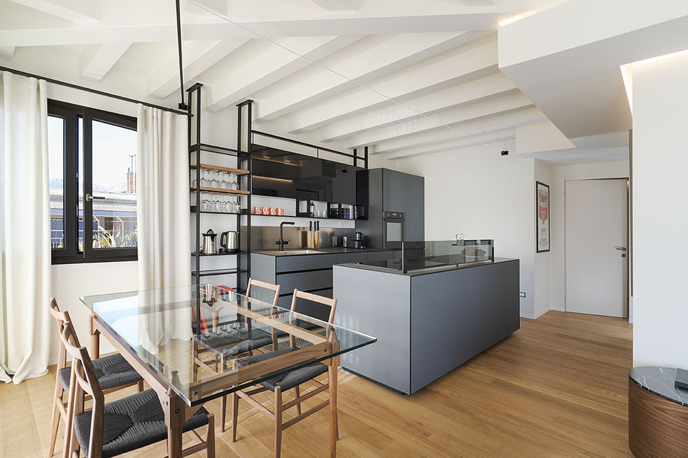 The penthouse features elegant and thoughtfully curated interiors, designed with high-quality materials and upscale Italian furnishings. Inside, you will find two spacious bedrooms, two modern bathrooms, a bright and stylish living room, and a fully equipped contemporary kitchen. Every room has been crafted to offer both comfort and sophistication, creating a serene atmosphere above the vibrant city streets.